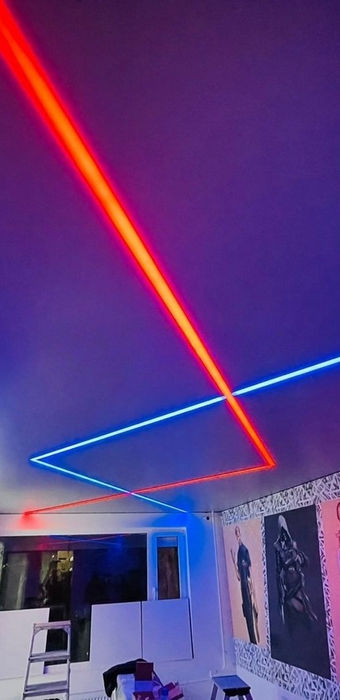 Floating Lines provide a sleek and futuristic lighting solution that enhances the aesthetic of your stretch ceiling. This option features LED strips embedded within the ceiling to create clean, sharp lines of light that appear to float above the surface. These illuminated lines can be used to accentuate specific areas or create dynamic patterns, adding a dramatic and visually striking effect to any room. Perfect for modern interiors, floating lines bring a distinctive and innovative touch to your ceiling design.